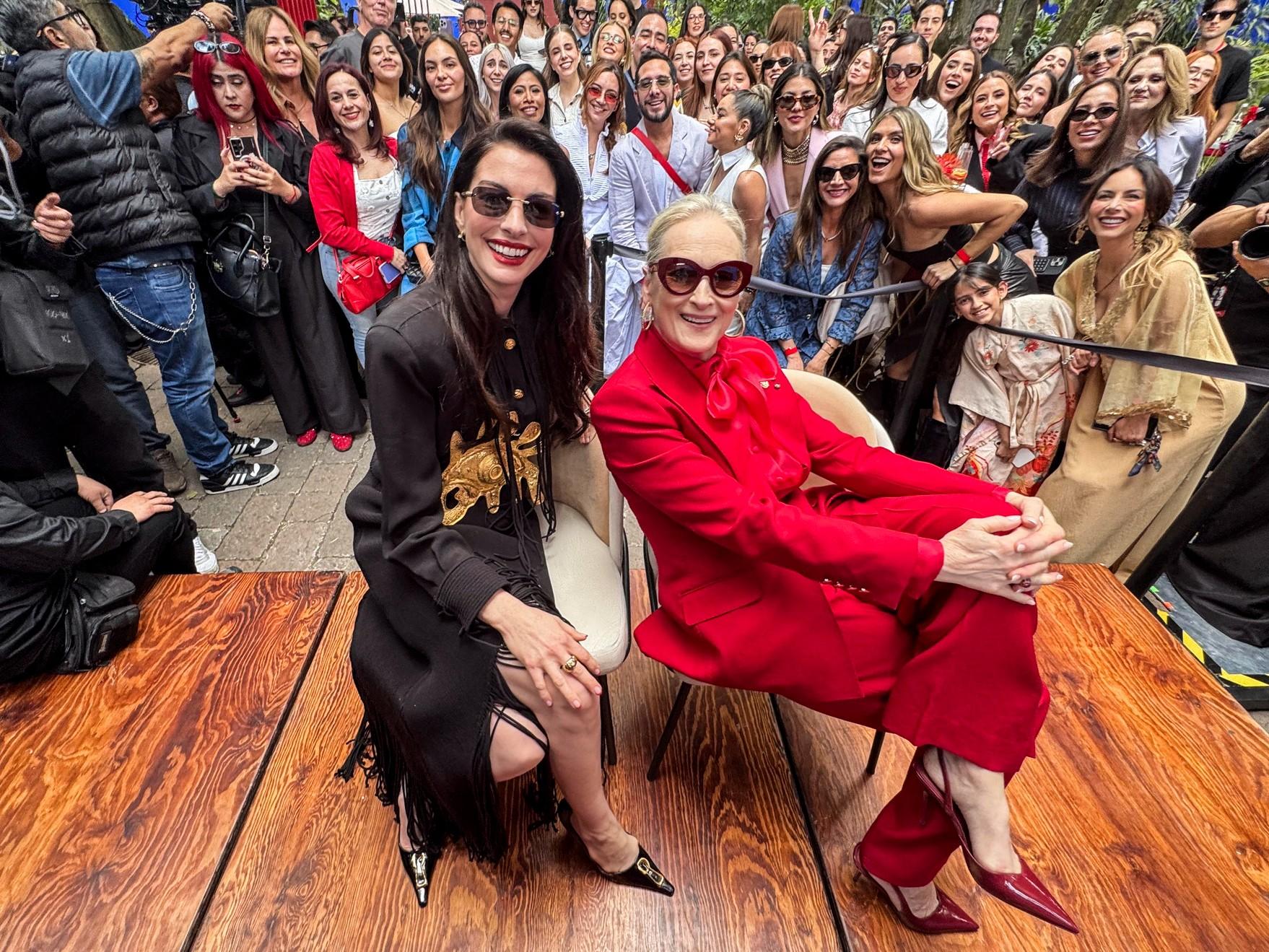Энн Хэтэуэй и Мерил Стрип первым делом отправились на бранч в Музее Фриды Кало. Энн была в образе Schiaparelli из коллекции осень-зима 2025. Черную рубашку она сочетала с юбкой-карандаш в тон, украшенной длинной бахромой, а на талии у нее красовался пояс с крупным золотым символом Дома — глазом.