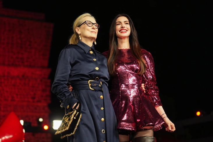 Затем они отправились на премьеру и сменили аутфиты. Хэтэуэй на этот раз блистала в мини-платье Stella McCartney с высокими сапогами, точно как было на показе бренда пару месяцев назад. Стрип же вновь решила отдать дань своей героине, выбрав образ под стать Миранде Пристли: темно-синее платье Schiaparelli, а также серьги и сумку того же Дома.