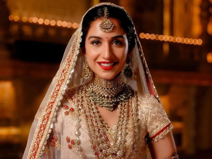 Свадебным нарядом Радхики занимались ведущие модельеры Индии Абу Джани и Сандип Хосла. Несомненно, для свадьбы, которая обошлась богатейшей семье этой страны в 600 миллионов долларов, весь праздничный образ должен был иметь чрезвычайно сложную структуру (читайте также: «Все деньги мира: 12 самых роскошных и дорогих свадеб нашего времени»). Ансамбль ручной работы цвета слоновой кости состоит из шлейфа из гхагры, на который наложен второй съемный шлейф, пятиметровой фаты и тканевой дупатты на плечах.