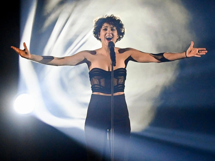 Однако участнице этого года определенно удалось поразить присутствующих. Все потому, что ее манера исполнения напоминает Эдит Пиаф, а костюм поражает воображение. Для конкурса певице изготовили черное платье с более чем шестью тысячами страз и пайеток, длиной в несколько метров.