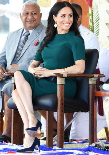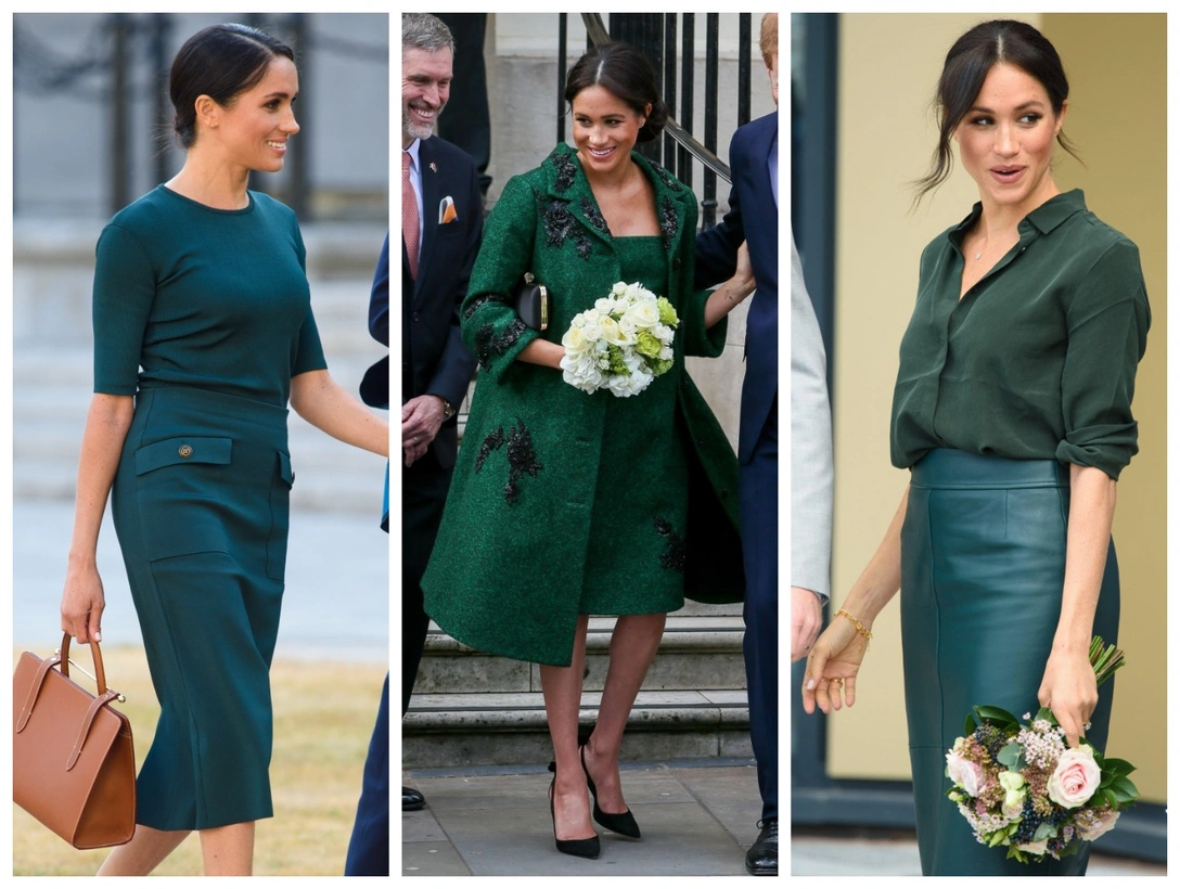 До этого на ежегодной церемонии вручения наград WellChild Awards в Лондоне 15 октября 2019 года Меган была одета в зеленое платье P.A.R.O.S.H. На мероприятии в честь Дня Содружества в Канадском доме 11 марта 2019 года Меган появилась в комплекте из расшитого черным бисером и пайетками шерстяного пальто и платья Erdem, восхитив модных обозревателей. До этого Меган прославилась комплектом из зеленой блузки &Other Stories и кожаной юбки Hugo Boss. Ну а зеленый комплект Givenchy, который Сассекская продемонстрировала в Ирландии в 2018 году, оказался настолько удачным, что недавно она повторила его в черном цвете.