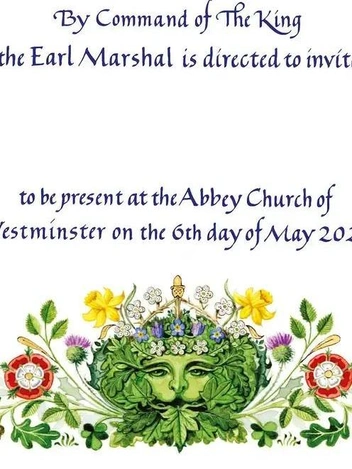 Джеймисон включил в приглашение изображение Зеленого человека, «древней фигуры из британского фольклора, символа весны и возрождения, чтобы отпраздновать новое правление», говорится в пресс-релизе. По данным дворца, листва из боярышника, плюща и дуба создает форму Зеленого человека, а также можно разглядеть «символические цветы» Соединенного Королевства.