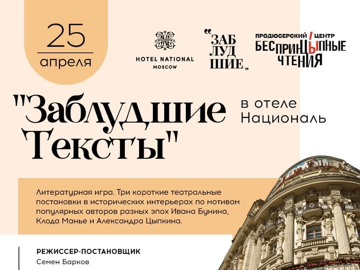 Создатели проекта выбрали для постановки фрагменты произведений трех авторов, где действие происходит в гостиничных номерах. Классику представляют Иван Бунин и Клод Манье, современность — Александр Цыпкин. Писатель, к слову, станет специальным гостем премьеры и главным «судьей» в литературном «поединке», который состоится после показа спектаклей. Помимо этого зрителей ожидает экскурсия по отелю «Националь», напитки, угощение и диджей-сет. Иначе говоря, насыщенный, интересный литературно-театральный день, полный впечатлений, по которым мы все так соскучились.