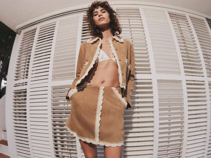 В вашем гардеробе обязательно должны оказаться расклешенные джинсы, жилет из денима, рубашка или платье с перфорацией, а также блузы и сарафаны с широкими рукавами и принтом. На каждый день дизайнеры Maje советуют выбрать стильный замшевый комплект с юбкой и укороченным жакетом, декорированный кружевом.