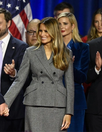 Несмотря на то, что, по словам источников, миссис Трамп никак не хотела, чтобы ее муж снова возвращался в политику, Мелания появилась на торжестве в идеальном образе. То был костюм из кашемира светло-серого оттенка с черными пуговицами, который подчеркивал фигуру будущей Первой леди. Он состоял из пиджака с четкой линией плеч и юбки-карандаш длины макси. Образ завершила фирменная укладка Мелании и лодочки из змеиной кожи на высоком каблуке. К слову, этот лук порядком отличался от того расслабленного выхода, который Мелания показала в день голосования (читайте также: Женщина в черном: Мелания Трамп была на выборах в мрачном и скромном).