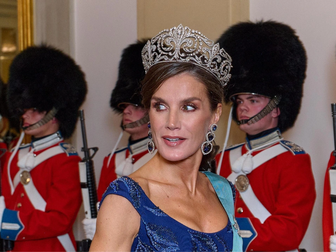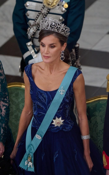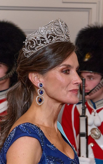 Королева Испании выбрала роскошные украшения — геральдическую бриллиантовую тиару, бриллиантовый браслет и крупные серьги с сапфирами. Эту тиару в XX веке заказал король Альфонсо ХIII для своей невесты Виктории Евгении Баттенберг — она стала ее свадебным подарком и любимым украшением. С тех пор у тиары интересный смысл — ее могут носить только королевы Испании по особенным торжественным случаям. Сапфировые серьги тоже с историей — раньше они принадлежали свекрови Летиции, королеве Испании Софии.