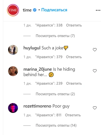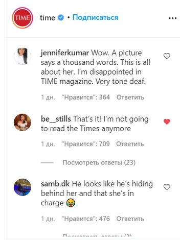 Поклонников Гарри также возмутило то, что он стоит позади своей жены и одет в простое черное поло с длинными рукавами и черные брюки, в то время как Меган в белом комбинезоне перетягивает все внимание на себя. Они сочли, что после слухов об авторитарном характере герцогини это решение вызывает недоумение. «Обложка этого журнала действительно отражает динамику их отношений», — заметил один из комментаторов в аккаунте Time. «Фото демонстрирует, кто контролирует ситуацию», — добавил другой.