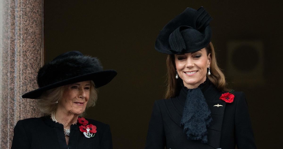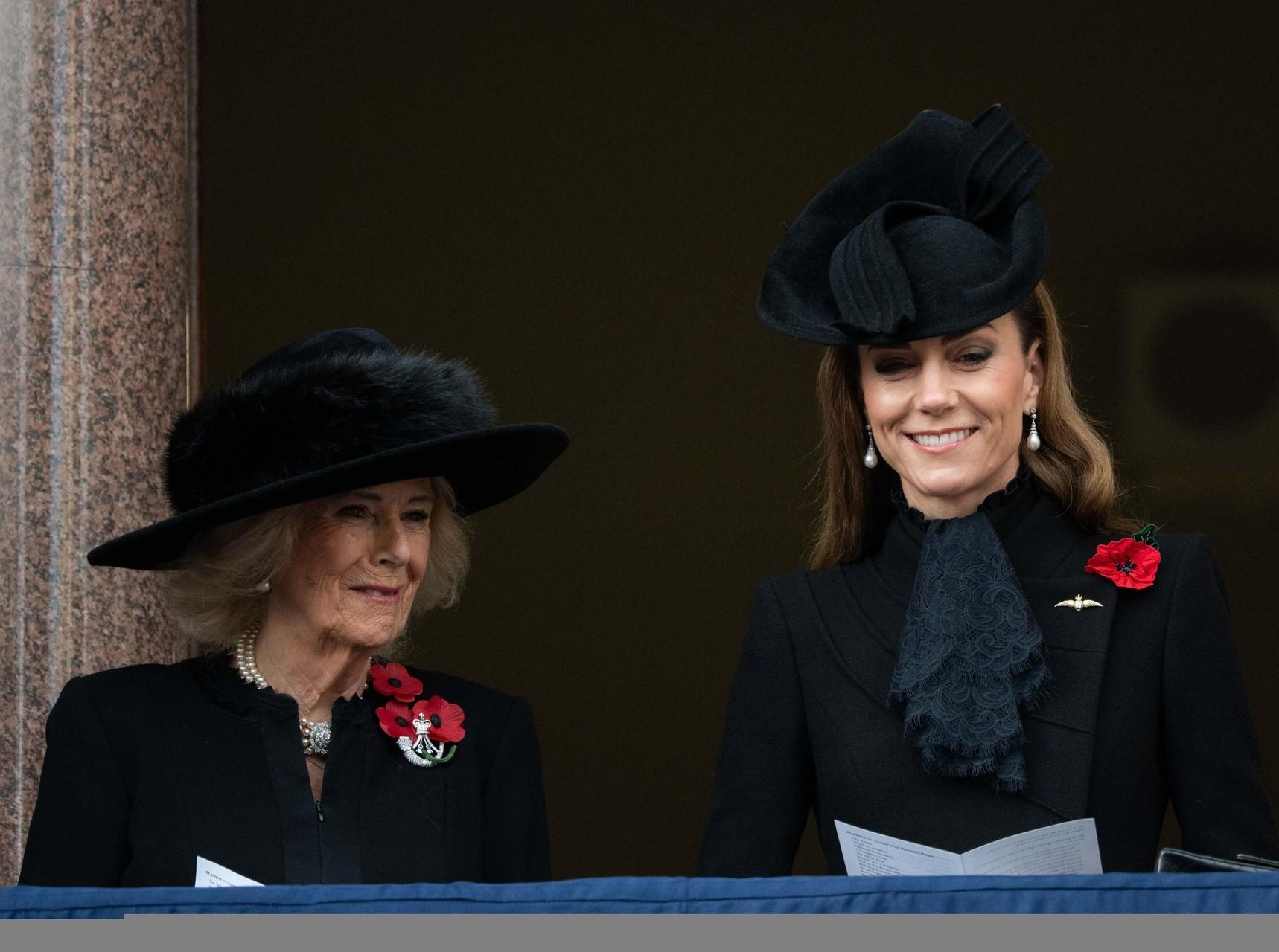 Кейт стояла рядом с королевой Камиллой, которая была одета в строгий жакет с высоким воротником и черный кружевной шарф, который она дополнила большим черным плюшевым перше Belvedere от Lock Hatters.