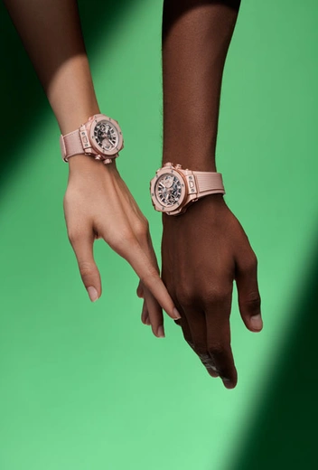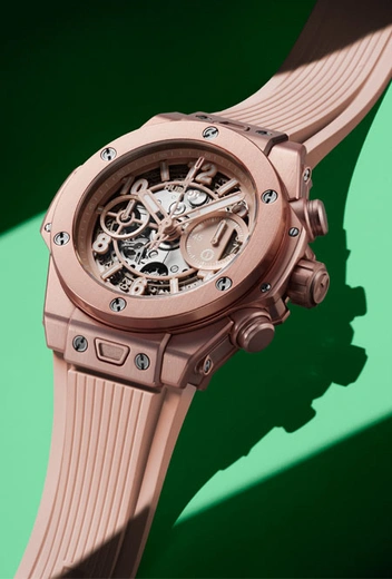 Любовь к этому цвету решил выразить швейцарский бренд Hublot, который вместе Лапо Элканном, основателем и креативным директором Garage Italia, создал новую модель Big Bang Millennial Pink. Новинка вышла лимитированным тиражом в 200 экземпляров. «Часы Big Bang Millennial Pink, который мы создали вместе с Лапо Элканном из Garage Italia, идеально вписываются в наше новаторское видение, – рассказал Рикардо Гвадалупе. – Наш опыт в области экспериментов с материалами позволил нам создать для этих часов уникальный цвет – Millennial Pink, символизирующий мир в его постоянном движении». Создание корпуса с такими характеристиками стало возможным благодаря исследованиям, проведенным инженерами Hublot. Этот процесс не только помогает добиться необходимого оттенка корпуса, но и наделяет его исключительной стойкостью к царапинам и ударам.