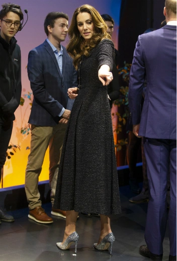Приталенное твидовое платье длины миди, в котором Кейт отправилась на благотворительный показ мюзикла, было дополнено клатчем на твердом каркасе и остроносыми лодочками, усыпанными стразами. Модные обозреватели заявляют, что выбранную пару сережек герцогиня Кембриджская надевает не в первый раз. Первый такой выход состоялся в 2011 году. Тогда серьги дополнили платье Alexander McQueen, выбранное Кэтрин для церемонии вручения наград Британской академии кинематографического и телевизионного искусства BAFTA. Герцогиня вновь надела украшения в 2017 и 2018 году.