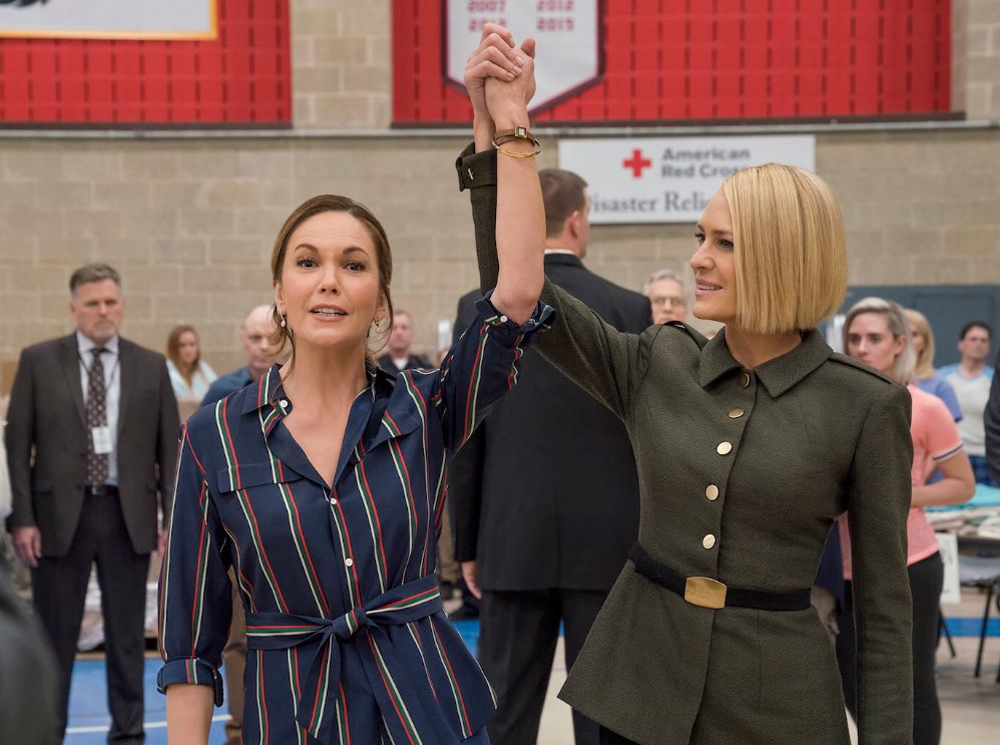 На снимках запечатлены Робин Райт в роли Клэр Андервуд в компании героев Аннет и Билла Шеперд в исполнении Дайан Лейн и Грега Киннира. На одной из фотографий Клэр, занявшая кресло президента после мужа, общается с Шепердами, на другом демонстрирует Биллу то самое знаменитое кольцо FU (Frank Underwood), принадлежавшее Фрэнку. На третьем миссис Андервуд вместе с персонажем Лейн запечатлена на фоне пункта Центра снижения риска стихийных бедствий Красного Креста.