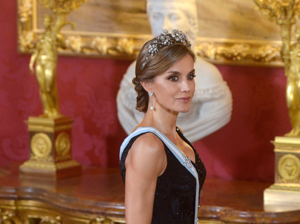 Обычно королевские особы предпочитают не обнажать плечи. Но королева Испании ─ одна из немногих, кому прощается подобная вольность. Летиция появилась в черном топе с декольте и длинной черной юбке с белыми цветами, причем подобная смелость не казалась провокационной. На груди Ее Величества красовалась бело-голубая лента ─ отличительный знак Дамы Большого креста ордена Карлоса III. Голову королевы украшала бриллиантовая тиара Mellerio Floral (наследство королевы Софии), а дополняли образ серьги-капли.