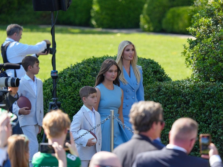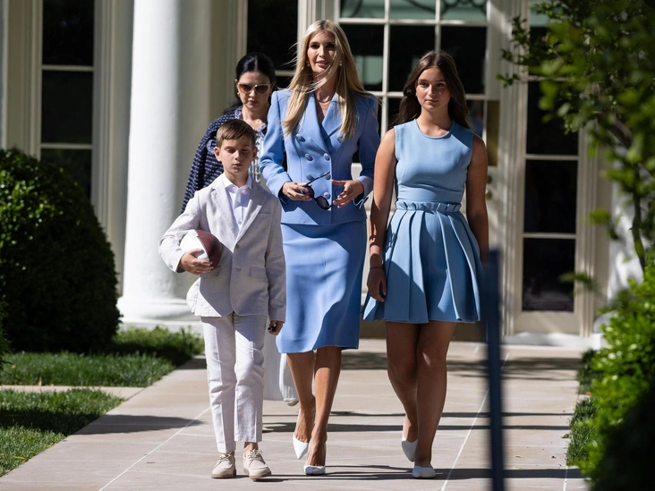Иванка прибыла на Южную лужайку Белого дома вместе с дочерью Арабеллой, и сыновьями Джозефом и Теодором. Для этого события девушка выбрала стильный и очень дорогой наряд: шерстяной жакет Dolce & Gabbana стоимостью более 3 тысяч долларов она дополнила подходящей голубой юбкой, жемчужными серьгами и парой кремовых туфель.
