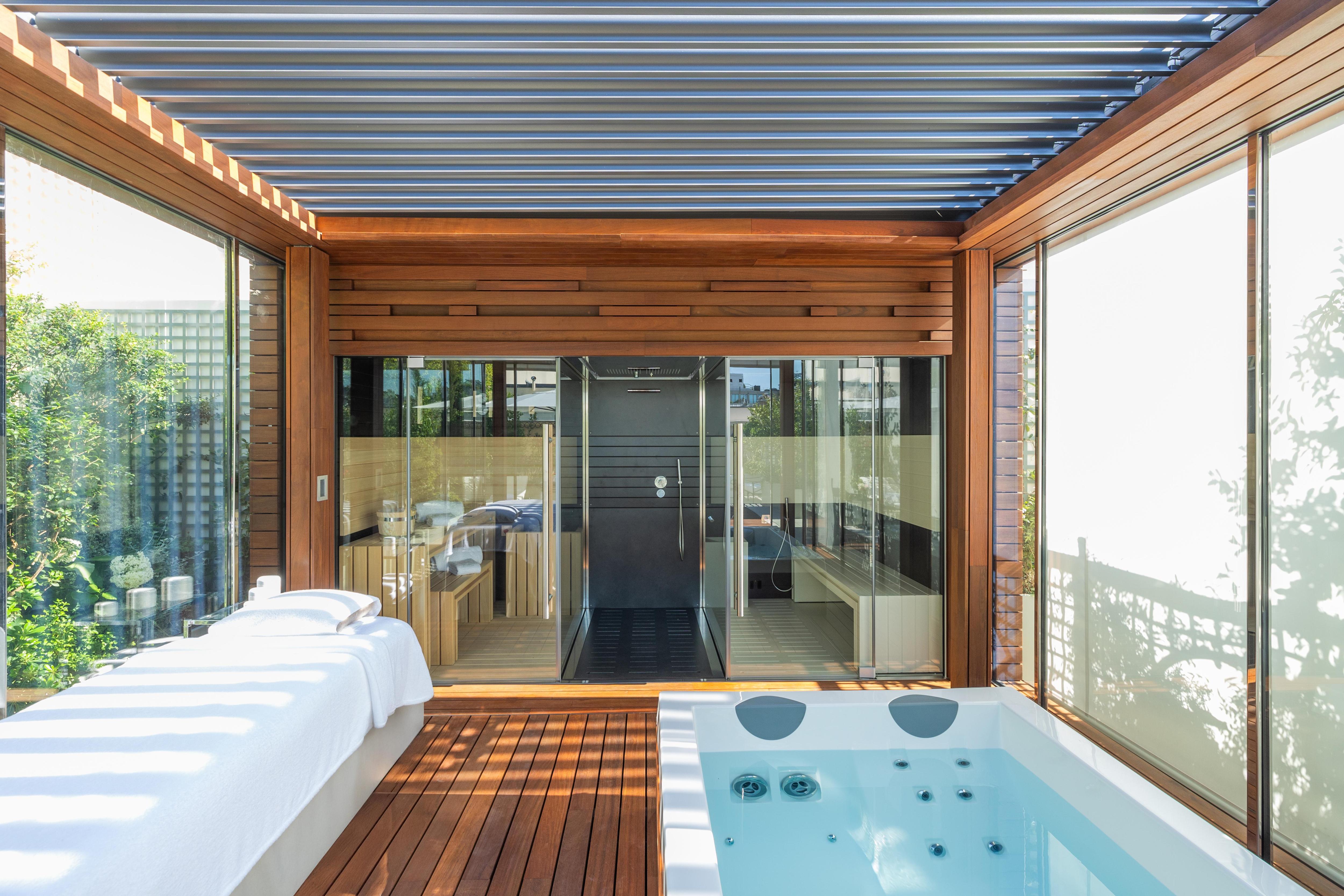 Еще одна интересная деталь номера — застекленная wellness-зона, окруженная растениями. В ней расположились хаммам, сауна, тропический душ, джакузи и массажный стол. Пространство можно использовать в любое время суток.