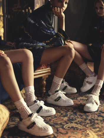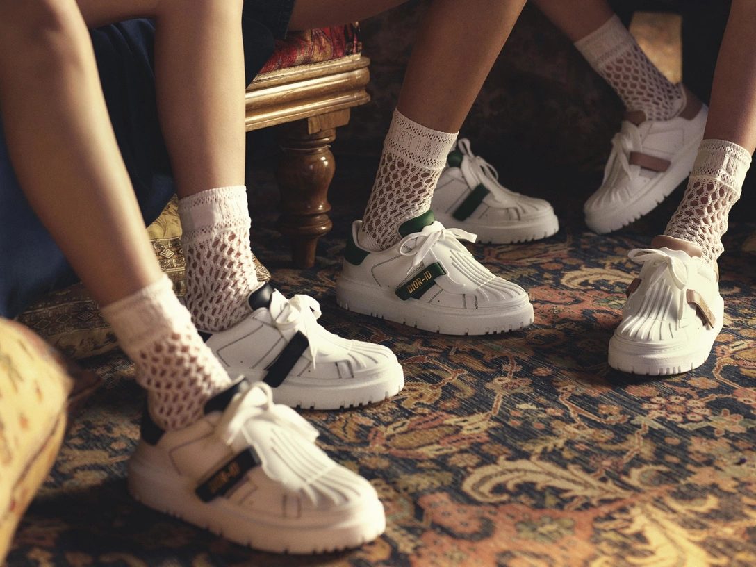 Свою нашумевшую новинку выпустил и французский Дом Dior. Модель из кожи носит название Dior-ID. Новинка имеет мягкие фактурные детали, украшенные золотым логотипом, который размещен на цветной застежке. Dior-ID сочетает в себе винтажную эстетику с яркими современными элементами и доступна в четырех классических цветах: темно-синем, телесном, зеленом и красном. Модель имеет массивную платформу, но при этом выглядит довольно сдержанно и универсально, что позволяет интегрировать ее не только в образы в стиле спорт-шик, но и более сдержанные и классические наряды.