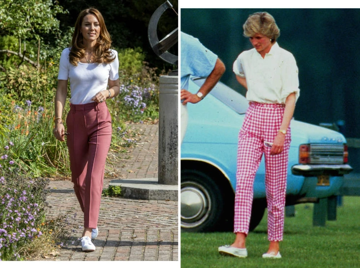 Баланс, который удалось найти герцогине Кэтрин, заставил модных обозревателей вспомнить о стиле ее покойной свекрови. Принцесса Диана нередко появлялась на публике в брюках как в 80-х, так и в 90-х. Некоторые из модных критиков вспомнили образ принцессы Уэльской с розовыми брюками в нежную клетку виши, белой рубашкой и белыми мокасинами. Несмотря на разницу в текстурах и принт, комплекты Дианы и Кейт роднит непосредственность, удивительным образом граничащая с лоском и выверенностью.