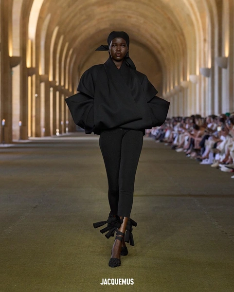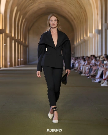 На презентации Jacquemus Наталья представила полностью черный образ из брюк и приталенного жакета с покатыми плечами. Швы на одежде и сумке, которые представляла модель, были украшены зигзагообразными деталями из ткани.