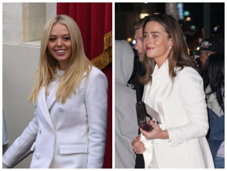 Тиффани сделала выбор в пользу невероятно популярного ливанского бренда Elie Saab. И в этом обозреватели увидели особый символизм, ведь у ее жениха Майкла ливанское происхождение. Журналисты также отметили, что дочь Трампа предпочла довольно неожиданный для нее фасон — с длинными рукавами, элегантным полукруглым декольте, трапециевидным подолом с волнистым кантом и акцентом на мерцающую вышивку. Образ дополнили голливудские локоны в любимом мисс Трамп платиновом оттенке, драгоценные серьги и невесомая вуаль. Королевский размах наряд приобрел за счет огромного шлейфа.
