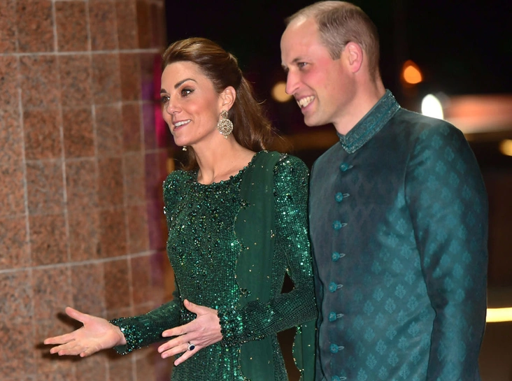 Уильям появился в традиционном для пакистанских мужчин костюме шервани (длинный пиджак прямого покроя) от местного дизайнера Naushemian (читайте также: «Как принцы Уильям и Гарри меняют модные правила для мужчин королевской семьи»). Герцогиня же выбрала блестящее вечернее платье от Jenny Packham насыщенного изумрудного оттенка (цвет национального флага Пакистана).
