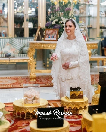 После Бербедак Манди невеста переодела красный традиционный наряд на белое, более привычное свадебное платье, и отправилась в зал с дарами от семьи и подданных. Подробные фотографии подарков делать не принято — зато мы можем рассмотреть кружевное белое платье Аниши Росна, которое дополнила фата в тон и серьги с бриллиантами и жемчугом (читайте также: Сокровища Виндзоров: самые дорогие украшения британской королевской семьи).