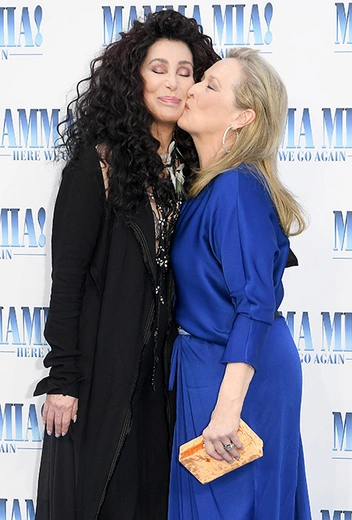 Мэрил Стрип выбрала платье насыщенного синего оттенка и при виде поп-дивы Шер не скрыла эмоций: звезды обменялись поцелуем перед камерами к огромному восторгу фотографов.
