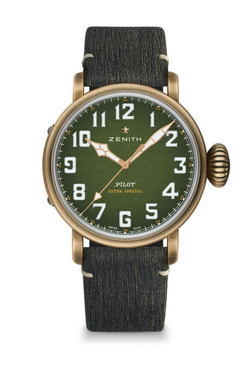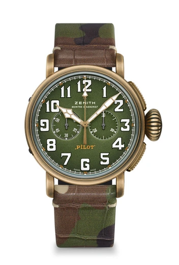 Прототипом дизайна Pilot Type-20 Adventure также стала модель авиационных часов – точные, надежные и практичные спутники в путешествиях. Фирменный 45-миллиметровые корпус выполнен из бронзы, а на прочной задней крышке из титана нанесен логотип Zenith Flying Instruments, что стало отсылкой к первым образцам-предшественникам Zenith. В угоду практичности арабские цифры имеют люминесцентное покрытие Super-LumiNova – так точное время можно будет узнать даже в темноте. К часам прилагается два варианта сменных ремешков: цвета хаки из телячьей кожи и в камуфляжной расцветке из кожи аллигатора.