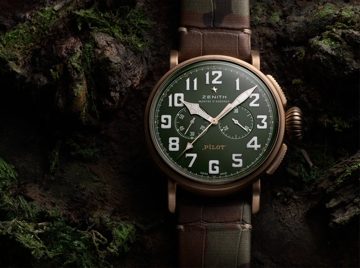Прототипом дизайна Pilot Type-20 Adventure также стала модель авиационных часов – точные, надежные и практичные спутники в путешествиях. Фирменный 45-миллиметровые корпус выполнен из бронзы, а на прочной задней крышке из титана нанесен логотип Zenith Flying Instruments, что стало отсылкой к первым образцам-предшественникам Zenith. В угоду практичности арабские цифры имеют люминесцентное покрытие Super-LumiNova – так точное время можно будет узнать даже в темноте. К часам прилагается два варианта сменных ремешков: цвета хаки из телячьей кожи и в камуфляжной расцветке из кожи аллигатора.