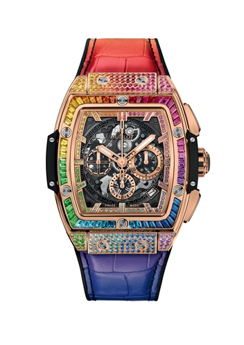 Семь знаменитых цветов также обыграны и в ремешках из кожи аллигатора. Эти две новинки повторяют успех коллекции Spirit of Big Bang.. Уникальная конструкция корпуса позволяет использовать бесконечное количество комбинаций материалов и цветов и скрывает в себе механизм Hublot HUB4700, который ценители считают одним из лучших швейцарских хронографов, которые когда-либо были созданы.