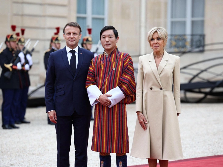 Наконец, на мероприятии показался и принц Бутана Джигель Угьен Вангчук, присутствие которого подтвердилось совместным фото с Макронами.