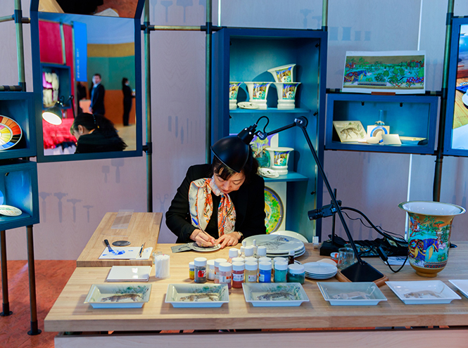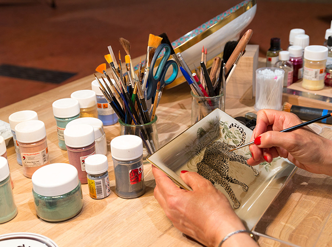 Уголок художника по фарфору: увидеть роспись фарфора как художник наносит контур твердым пером, а рисунок – кистью из соболя (большие участки прокрашиваются губкой) и почувствовать запах цветного пигмента и лака.