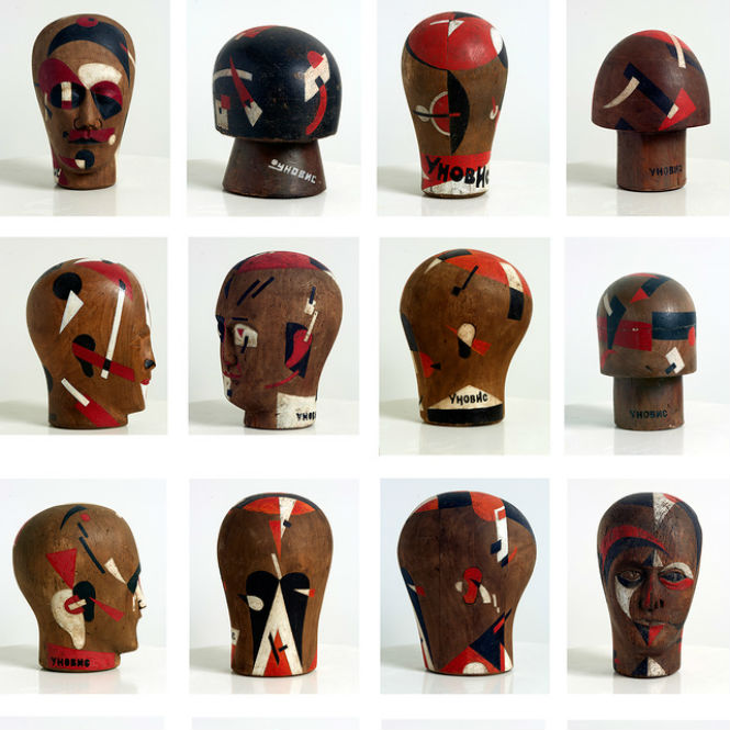 Выставка «Собрание вершин» представляет зрителю подлинно уникальный материал. Чаще всего метод транс временного сравнения икон и работ целого ряда художников русского авангарда применяют к произведениям, выполненным на плоскости (доске, холсте,стене, покрытой фресками, либо другой живописной основе). Галерея VSunio собрала из различных источников и экспонировала в своем арт-пространстве целую коллекцию деревянных голов-манекенов для шляп, декорированных супрематической живописью и подписанных коллективным именем «УНОВИС». Блестящее доказательство ключевого принципа уновизма здесь воплощается не в плоскостных, а в пространственных формах. Зритель получает наглядное доказательство интереса к пространственным формам, который был одним из ключевых направлений деятельности витебского УНОВИСа, наряду с графикой, картиной и монументальным панно.