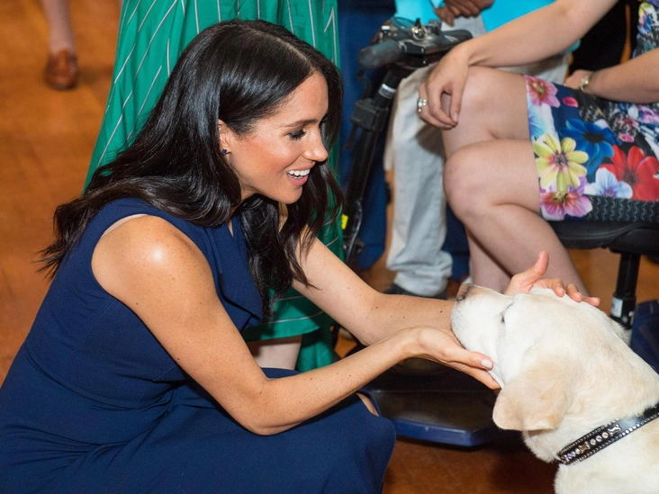 Герцогиня Сассекская гладит собаку-поводыря на приеме, устроенном губернатором штата Виктория в Доме правительства, 18 октября 2018