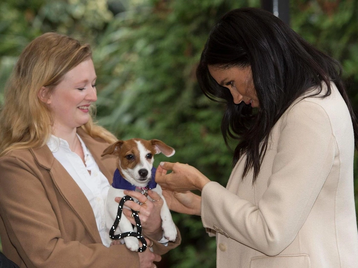 Меган встречает джека-рассела «Мэгги» с Эммой Драйвер и Зои Эдвардс во время своего визита в Мэйхью, благотворительную организацию по защите животных, 16 января 2019