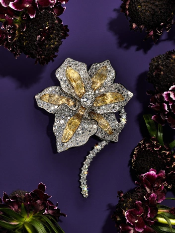 Еще одним, гораздо более экзотическим мотивом Botanica стала орхидея. Вдохновением для скульптурных и удивительно реалистичных работ стали броши-орхидеи Полдинга Фарнхэма, созданные им для стенда Tiffany на Всемирной выставке 1889 года в Париже. В одной из брошей-трансформеров ювелиры бренда искусно воспроизвели изящные изгибы лепестков платиной, освещая каждый из них мозаикой бриллиантов различной огранки — круглой и модифицированной «розы», а также классической круглой — акцентируя их «мазками» из 18-каратного желтого золота. Еще один мотив коллекции — чертополох — обретает изощренную фактуру в элегантных творениях. Выполненная вручную огранка «триллион» позволила расположить драгоценные камни так близко, как это только возможно, тем самым имитируя игольчатую текстуру чертополоха.
