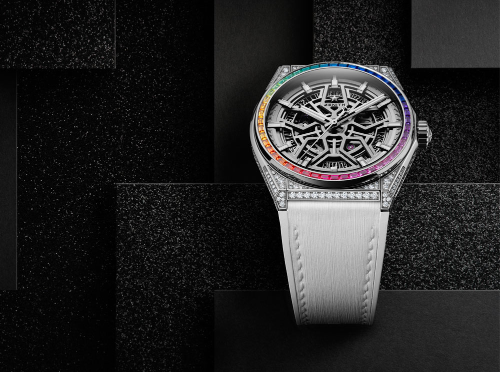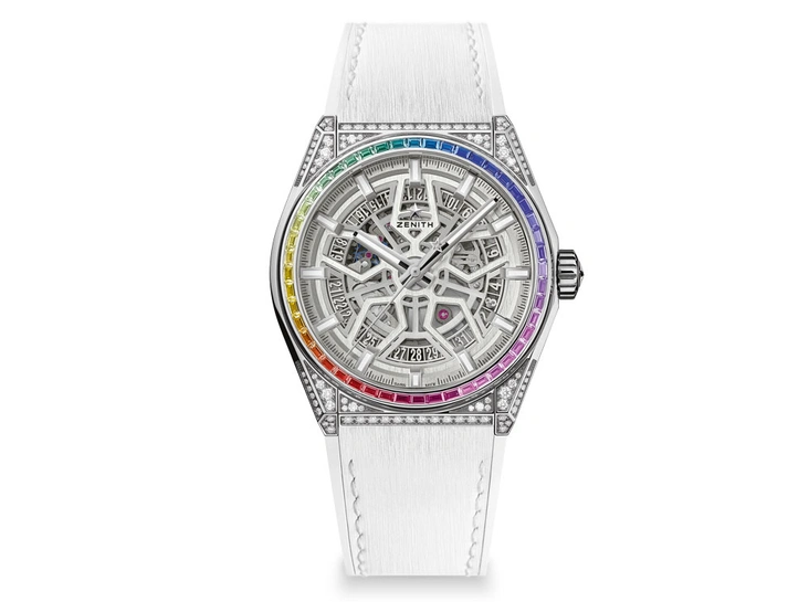 Zenith представил несколько символичных экземпляров из коллекции Defy – Defy El Primero 21 и DEFY Classic. Одним из удачных вариантов может стать новая модель Zenith Defy Classic High Jewellery Rainbow из коллекции ювелирного искусства, и она точно запомнится счастливой обладательнице. Матовый титановый корпус новинки украшают сапфиры багетной огранки – 48 переливающихся камней всех цветов радуги, выполненных с помощью градации цвета. Кроме того, вокруг них расположились бриллианты, которые идеально оттеняют блеск красочных сапфиров. Белый цвет каучукового ремешка тоже выбран не случайно – именно этот оттенок станет идеальной основой для перелива радуги на корпусе часов.