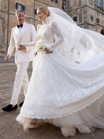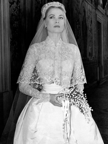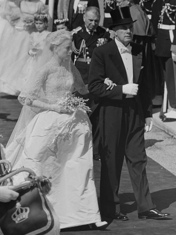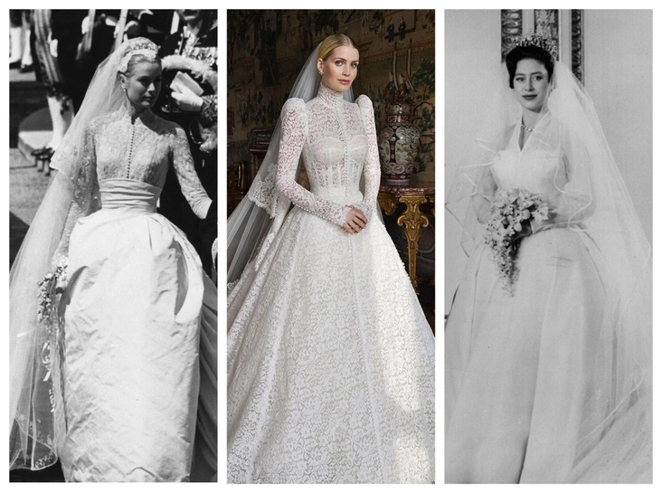 Наряд, в котором невеста отправилась к алтарю, пресса сразу начала сравнивать со свадебным платьем, ставшим настоящей сенсацией 65 лет назад. Речь о венчании Грейс Келли и князя Монако Ренье III, состоявшемся 18 апреля 1956 года. Актриса предстала перед публикой в фантастическом ансамбле с пышным подолом, затянутой талией и кружевным лифом с высоким воротником и длинными рукавами, созданном легендарной художницей по костюмам Хелен Роуз. Также на Грейс был кружевной головной убор, надежно фиксировавший ее фату.